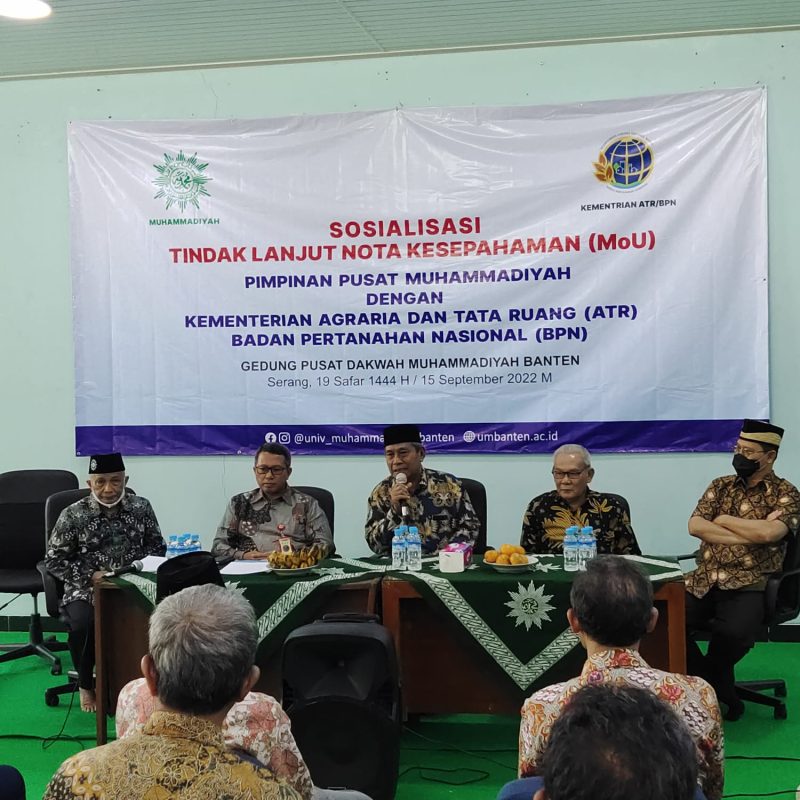 Menindaklanjuti penandatangan Nota Kesepahaman, Kamis (15/9/2022) bertempat di Aula Gedung Pusat Dakwah Muhammadiyah Banten, Kantor Wilayah Badan Pertanahan Nasional (BPN) Provinsi Banten mensosialisasikan Nota Kesepahaman ini.