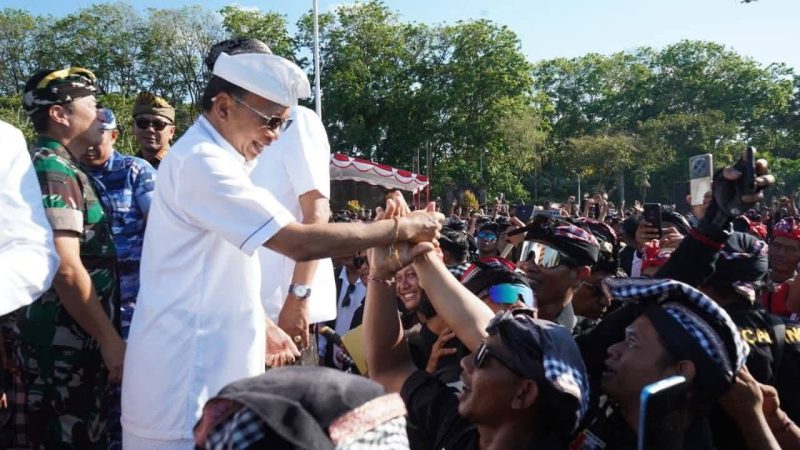 Denpasar, poskota.online – Gubernur Bali Wayan Koster serukan Pecalang Bali…Bali Aman, Bali Aman, Bali Aman, Merdekaaa…!!!gemuruh semeton Pecalang Bali yang memadati Lapangan Niti Mandala Renon Bali.