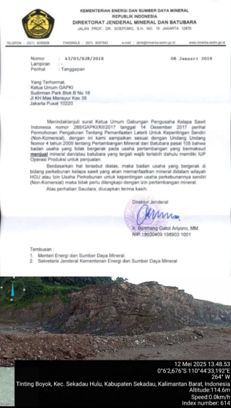 “Ini jelas melawan hukum. Banyak perusahaan sawit menggunakan dalih surat dari Dirjen Minerba untuk menggali material di HGU-nya tanpa membayar pajak galian C. Ini mencederai pengusaha legal yang sudah membayar pajak ke negara,” ujar Adi.