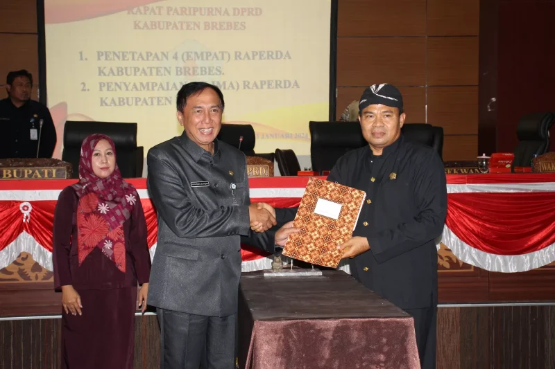 Kemudian penyampaian 5 Raperda Kabupaten Brebes yaitu tentang Tata Ruang Wilayah Kabupaten Brebes Tahun 2024–2044, Perlindungan Tenaga Kerja Lokal dan Pekerja Migran Indonesia, Perubahan Ketiga atas Peraturan Daerah Kabupaten Brebes Nomor 5 Tahun 2016 tentang Pembentukan dan Susunan Perangkat Daerah Kabupaten Brebes, Perubahan Bentuk Hukum Perusda BPR Brebes Menjadi Perseroan Terbatas Bank Perekonomian Rakyat Bank Brebes (Perseroda), dan Penyertaan Modal Pemerintah Kabupaten Brebes pada Perusahaan Umum Daerah Percepatan Puspa Grafika Kabupaten Brebes.