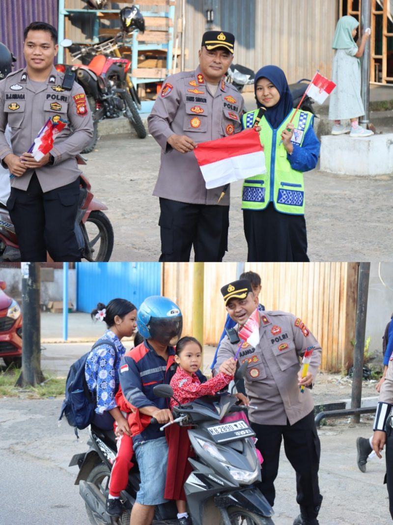 POLRES MELAWI Polda Kalbar Poskota Online- Menyambut Hari Kemerdekaan Republik Indonesia ke -80 tahun 2025, Kapolres Melawi Polda Kalbar AKBP Harris Batara Simbolon, S.I.K., S.H., M.Tr.Opsla pimpin langsung pembagian bendera di jalan Juang Km.1 tepatnya di depan SMP Negeri 1 Nanga Pinoh di dampingi Waka Polres Melawi Kompol Aang Permana, S.I.P., S.H., M.A.P, Pejabat Utama dan personel, Kamis (7/8)