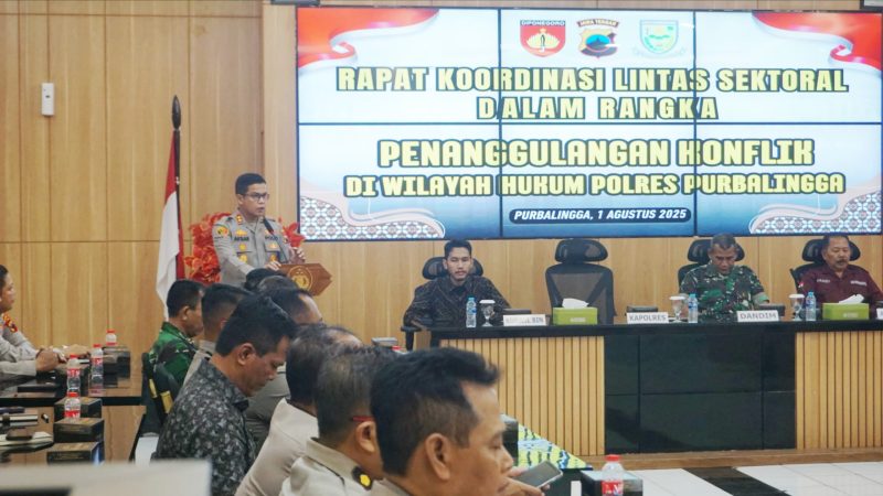 Poskota.online, Purbalingga – Polres Purbalingga menggelar rapat koordinasi (Rakor) lintas sektoral dalam rangka Penanggulangan Konflik di wilayah hukum Polres Purbalingga. Rapat dilaksanakan di Aula Wicaksana Laghawa Mapolres Purbalingga, Jumat (1/8/2025) siang.