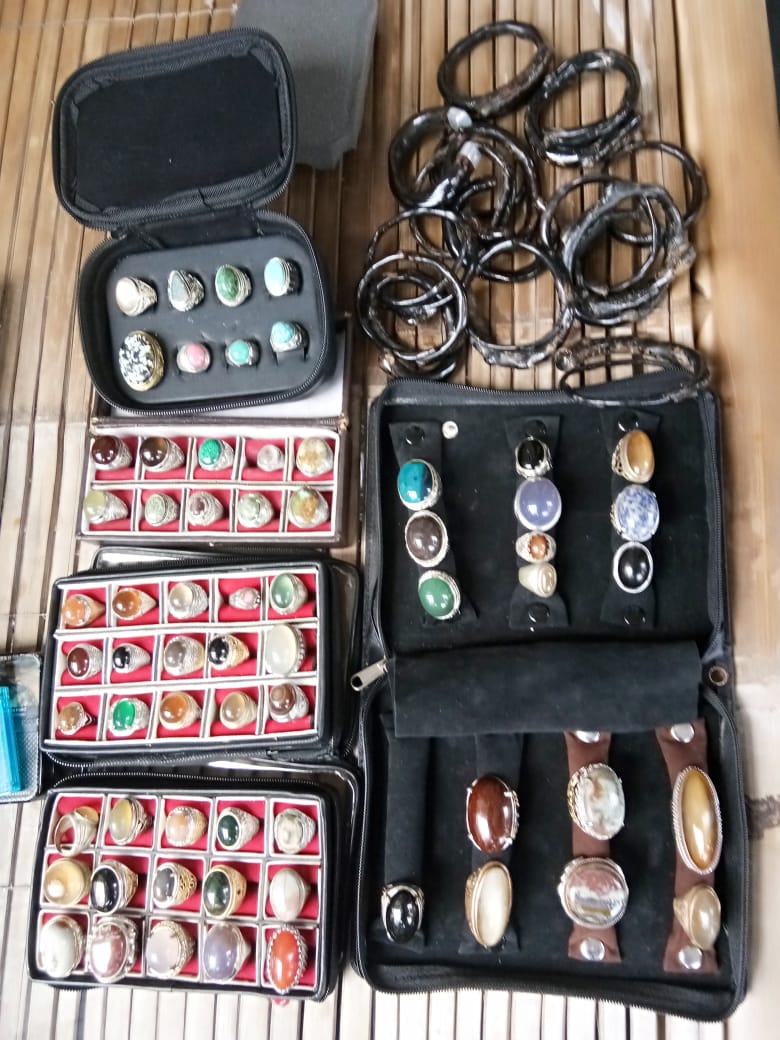 Beranekaragam koleksi batu akik nya yang menarik, mulai jenis Bacan Doko, aneka Pandan, Yaman, Ruby, Sapphire, Garut, Aceh, Kalimaya, Rafflesia dan banyak lagi dipajang dengan penuh keindahan, mulai ikatan ukuran kecil sampai ukuran besar yang menutup jari tangan. “Untuk cincin mulai dari harga 100 ribu-900 ribu, ada gelang Bahar mulai dari harga 50 ribu-300 ribu dan cangkok rokok harga 100 ribu-2 juta rupiah..” jelasnya.
