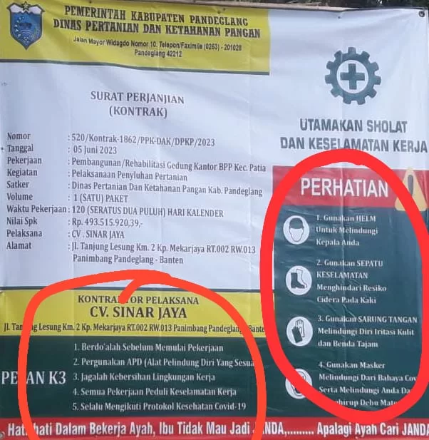 PANDEGLANG,Poskota.Online-“Pergunakan APD”, demikian salah satu Pesan K3 yang dituangkan oleh Kontraktor Pelaksana CV. Sinar Jaya dalam papan informasi proyek yang terpampang di lokasi pembangunan Gedung Kantor BPP Kecamatan Patia, Minggu (13/08/2023).