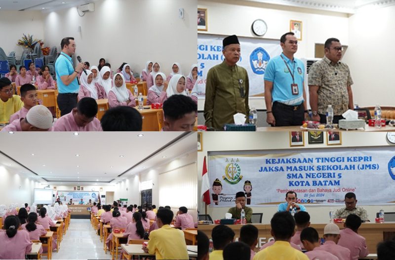 Batam,Poskota.Online-Dengan semangat yang teguh Tim Jaksa Masuk Sekolah (JMS) Kejati Kepri mensosialisasikan terkait bahaya Judi Online melalui program Pembinaan Masyarakat Taat Hukum (BINMATKUM) pada kegiatan Jaksa Masuk Sekolah (JMS) di SMA Negeri 5 Batam, yang diikuti para peserta didik / Pelajar dan Guru, Jumat (26/07/2024).