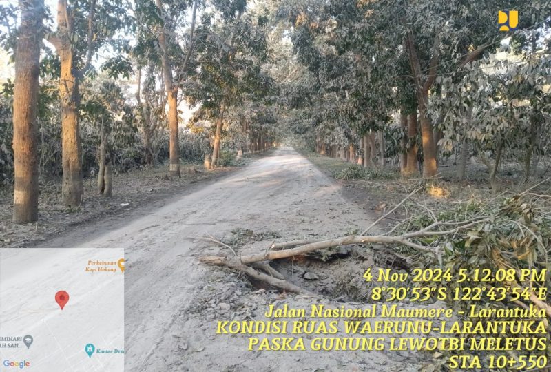 Ruas Waerunu – Larantuka merupakan akses utama dari Kota Maumere menuju Larantuka atau sebaliknya. Erupsi Gunung Api Lewotobi Laki-laki pada Minggu dini hari, (3/11/2024), sekitar pukul 23:57 WITA mengakibatkan ruas Jalan Waerunu – Larantuka, tepatnya di KM 217+100-KM 232+000 tertutup debu lumpur vulkanik dan pohon tumbang yang mengganggu arus lalu lintas.
