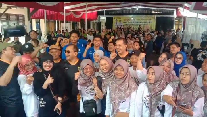 Ratusan buruh yang ikut jalan sehat dilepas oleh Wakil Bupati Pemalang dan Umroni Kepala Disnaker Pemalang ,