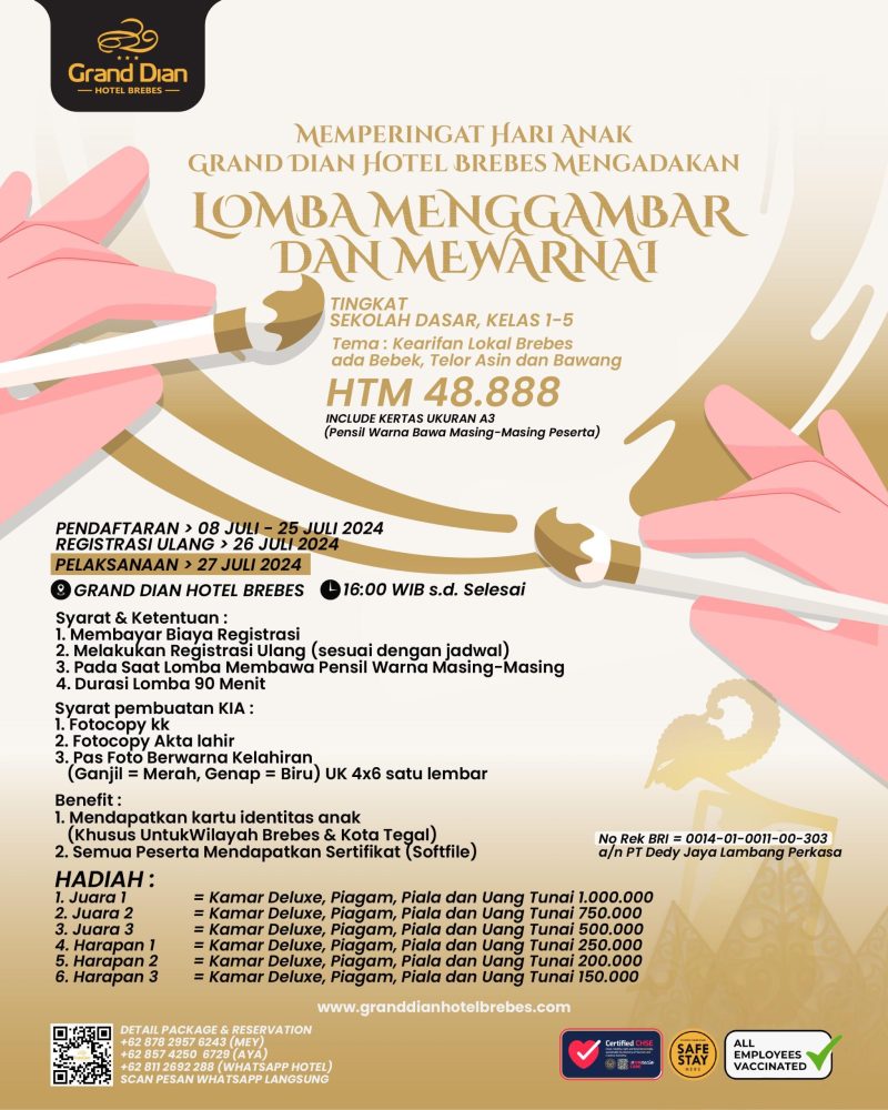 Brebes – Grand Dian Hotel Brebes siap merayakan Hari Anak Nasional dengan menggelar Lomba Menggambar dan Mewarnai untuk siswa Sekolah Dasar kelas 1-5. Acara yang dihelat pada 27 Juli 2024 ini bertujuan untuk merangsang kreativitas anak serta memberikan wadah bagi mereka untuk berekspresi.