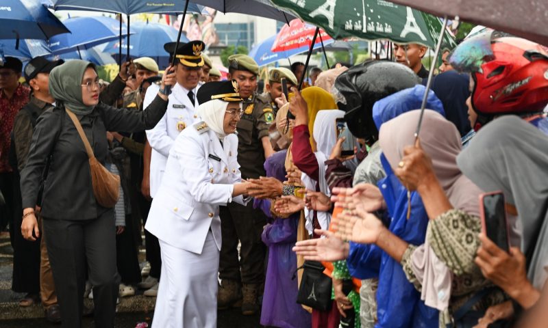 Saat turun dari kendaraan di sisi selatan Alun-alun, ribuan masyarakat sudah menunggu untuk menyambut dan menyalami Bupati Amalia Desiana dan Wakil Bupati Wahid Jumali yang di lantik oleh Presiden Prabowo pada 20 Februari lalu di Istana Presiden.