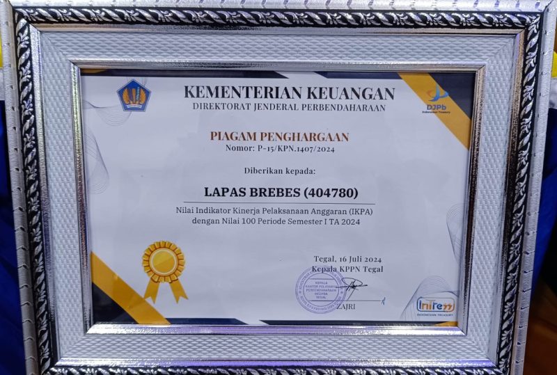 Brebes – Lembaga Pemasyarakatan (Lapas) Kelas IIB Brebes berhasil memperoleh penghargaan dari Direktorat Jenderal Perbendaharaan Kementerian Keuangan (Kemenkeu) Republik Indonesia Semester 1 Tahun 2024 dengan Nilai IKPA 100 Sempurna.
