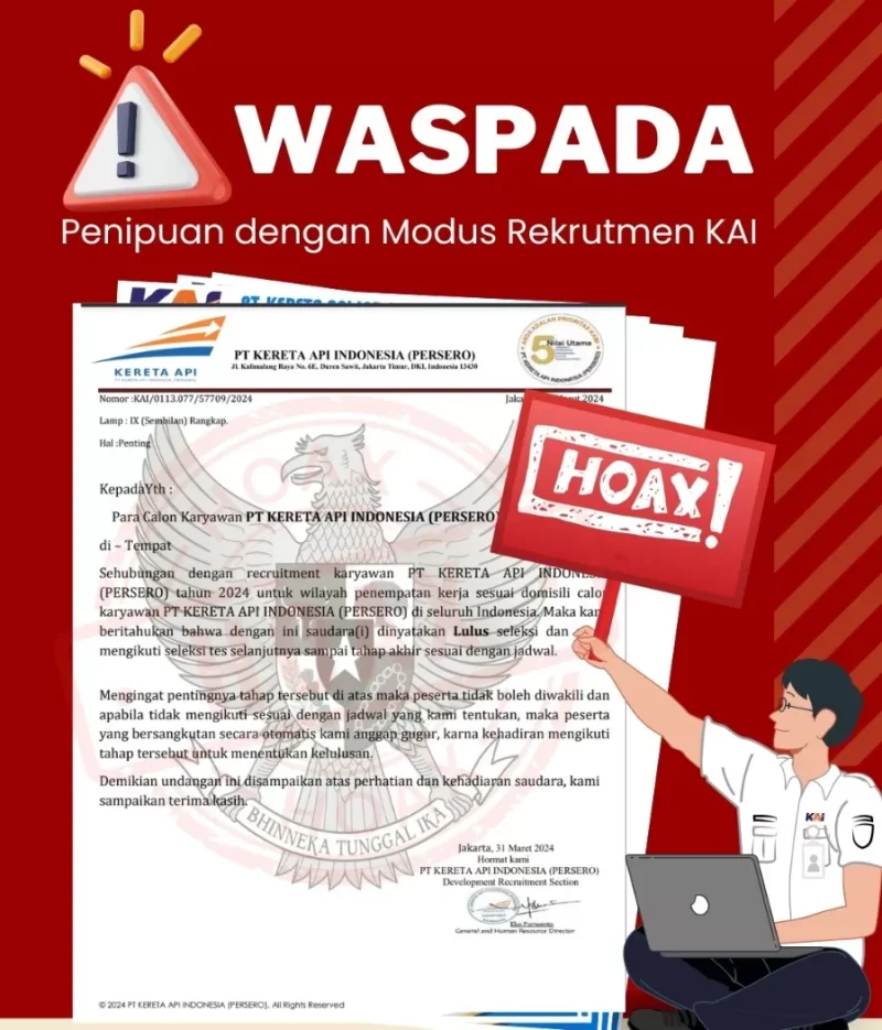 Menanggapi hal tersebut, KAI meminta masyarakat untuk mewaspadai segala bentuk penipuan dengan modus rekrutmen KAI.
