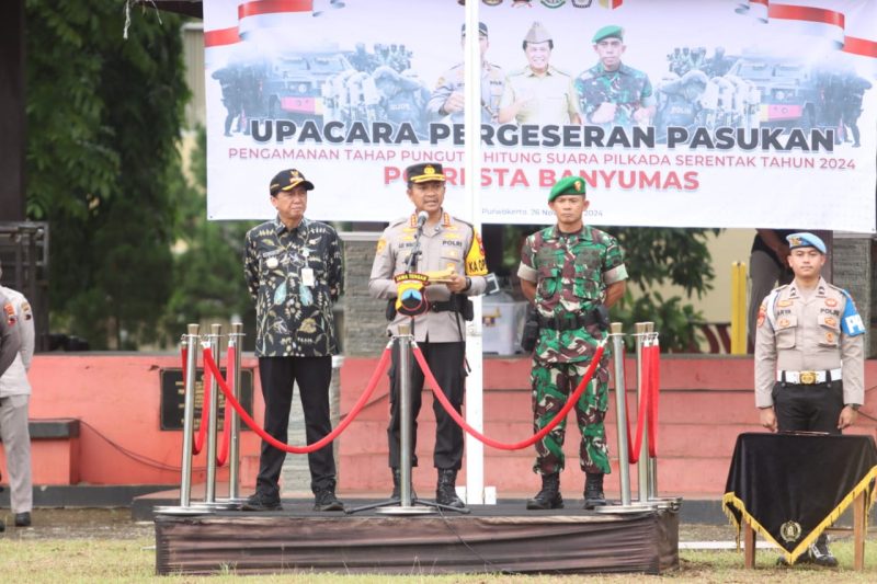 Banyumas, Poskota.online – Polresta Banyumas melaksanakan kegiatan Upacara Pergeseran Pasukan Pengamanan Tahap Pungut Suara Pilkada Serentak Tahun 2024, Selasa (26/11/24) yang dimulai pukul 08:00 wib.