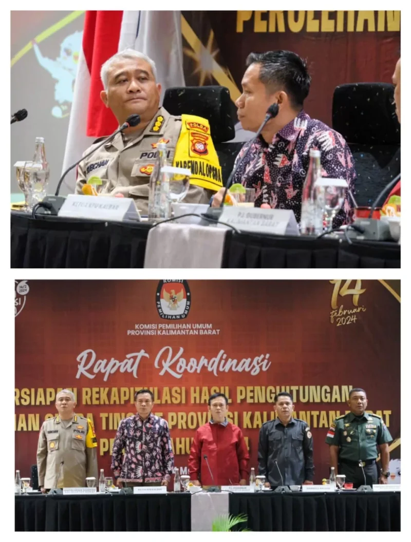 Pontianak,Poskota.Online-Kapolda Kalbar Irjen Pol Pipit Rismanto, S.IK.,M.H., yang diwakili oleh Karoops Polda Kalbar Kombespol Moch Noor Subchan,S.I.K.,M.H, beserta Dirintelkam Polda Kalbar Kombes Pol. Enggar Brotoseno, S.I.K, M.Si., menghadiri rapat dalam rangka persiapan rekapitulasi penghitungan cepat perolehan suara tingkat provinsi Kalimantan Barat, yang dilaksanakan oleh KPU Provinsi Kalimantan Barat bertempat di Hotel Mercure Pontianak pada hari Senin (4/3/2024)