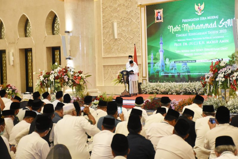 Mengusung tema “Isra Mi’raj dan Spirit Kerukunan Umat Menuju Indonesia Hebat”, dihadapan para jamaah Wapres menegaskan bahwa dengan meneladani sikap moderat yang dicontohkan Nabi Muhammad SAW, umat Islam di Indonesia dapat menjaga kerukunan yang hakiki, baik antar sesama pemeluk agama (Ukhuwah Islamiyah), antar sesama warga bangsa (Ukhuwah Wathaniyah), maupun antar sesama anak manusia (Ukhuwah Insaniyah).