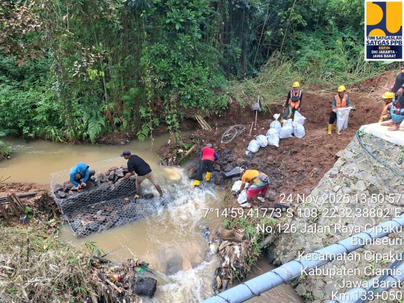 Jakarta — Kementerian Pekerjaan Umum (PU) mengambil langkah cepat untuk memulihkan akses nasional di area Jembatan Cikaleho, Ruas Batas Kabupaten Majalengka/Ciamis – Batas Kota Ciamis, setelah longsor besar terjadi pada Minggu malam (23/11/2025) akibat hujan deras.