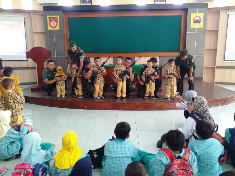 Sementara disampaikan Dandim Letkol Infanteri Tentrem Basuki melalui Peltu Agus Ratono, para tamu junior tersebut dikenalkan berbagai jenis pakaian dinas, senjata laras panjang dan pendek, kemudian gambar-gambar kendaraan dinas dan tempur 3 matra TNI, tepuk pramuka, serta tepuk selamat pagi.