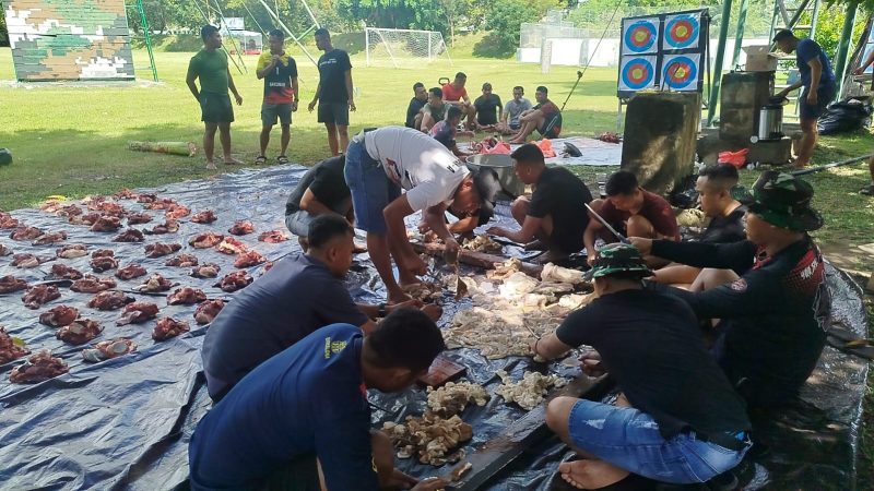 Kompi senapan (kipan) A batalyon infanteri (yonif) Raider 900/Satya Bakti Wirotama (SBW) di bawah komando komandan kompi (Danki) Kapten Inf Dimas Widi Wibowo S.T.Han menggelar sholat idul adha dan kegiatan pemotongan hewan qurban, di lapangan asrama kipan A raider 900/SBW, jalan raya Tuban, kec.kuta, kab.badung Jum’at 6/6/2025.