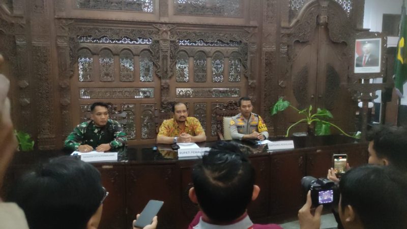 Pemalang, poskota.online – Komandan Kodim (Dandim) 0711/Pemalang Letkol Inf Muhammad Arif, S. Hub. Int., bersama Bupati Anom Widiyantoro, SE. M.M., dan Kapolres AKBP Eko Sunaryo SIK.MKP., melaksanakan Konferensi Pers (Konpres) dengan Awak media baik cetak, online dan TV yang ada di Kab. Pemalang pasca bentrok antara PWI LS dan FPI pada kegiatan pengajian Habib Rizieq Bin Syihab di Desa Pegundan Kec. Petarukan Kab. Pemalang, di Pendopo Kab. Pemalang, Kamis malam (24/7/25).
