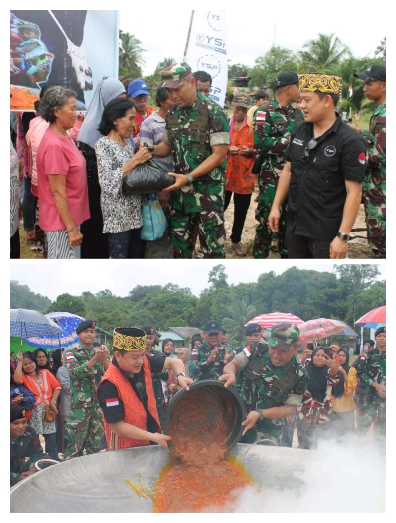 Selain memasak, kegiatan dilanjutkan dengan penyaluran paket sembako kepada masyarakat perbatasan. Bantuan ini diharapkan dapat meringankan beban ekonomi warga sekaligus mempererat hubungan antara TNI dan rakyat.