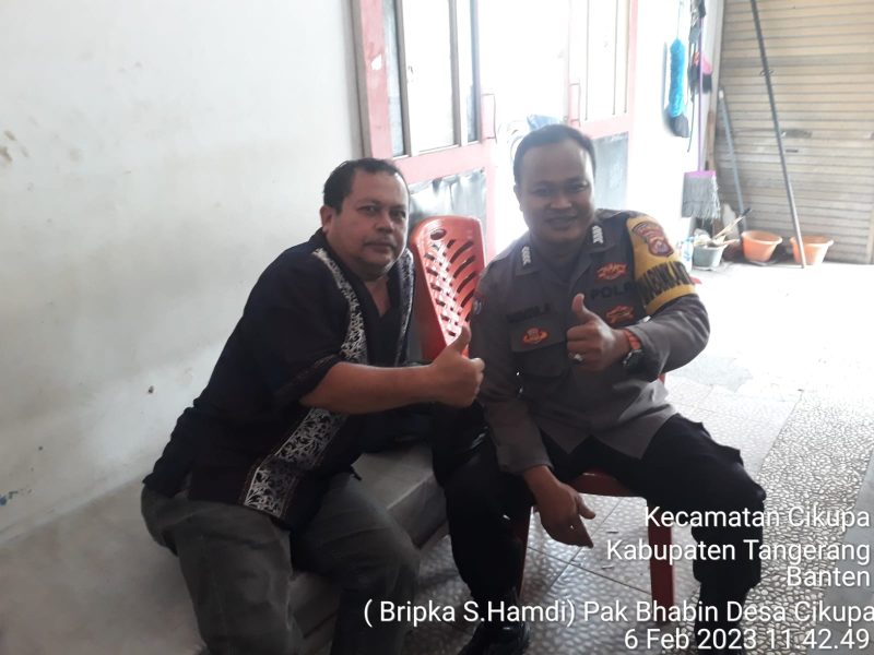 Kab.Tangerang,poskota.online – Bripka S Hamdi bhabinkamtibmas polsek cikupa polresta tangerang Polda Banten Yang Bertugas Kesehariannya Selaku Pembina di desa cikupa kecamatan cikupa kabupaten Tangerang, Melaksanakan tugas rutin monitoring wilayah adalah Wujud Kepedulian Bhabinkamtibmas Mendukung Program Kerja Kapolda Banten (Commander Wish)”Yuk Ngopi Wae” Dalam Kegiatan Dialogis Dan Monitoring Wilayah binaanya, Duduk Bareng Bersama warga masyarakat Bersilaturahmi Sambil” Yuuk Ngopi Wae” Bertempat kampung kadu sabrang Rt,05/02 desa cikupa kecamatan cikupa pada senin (06/02/2023) jam 11.45 Wib.