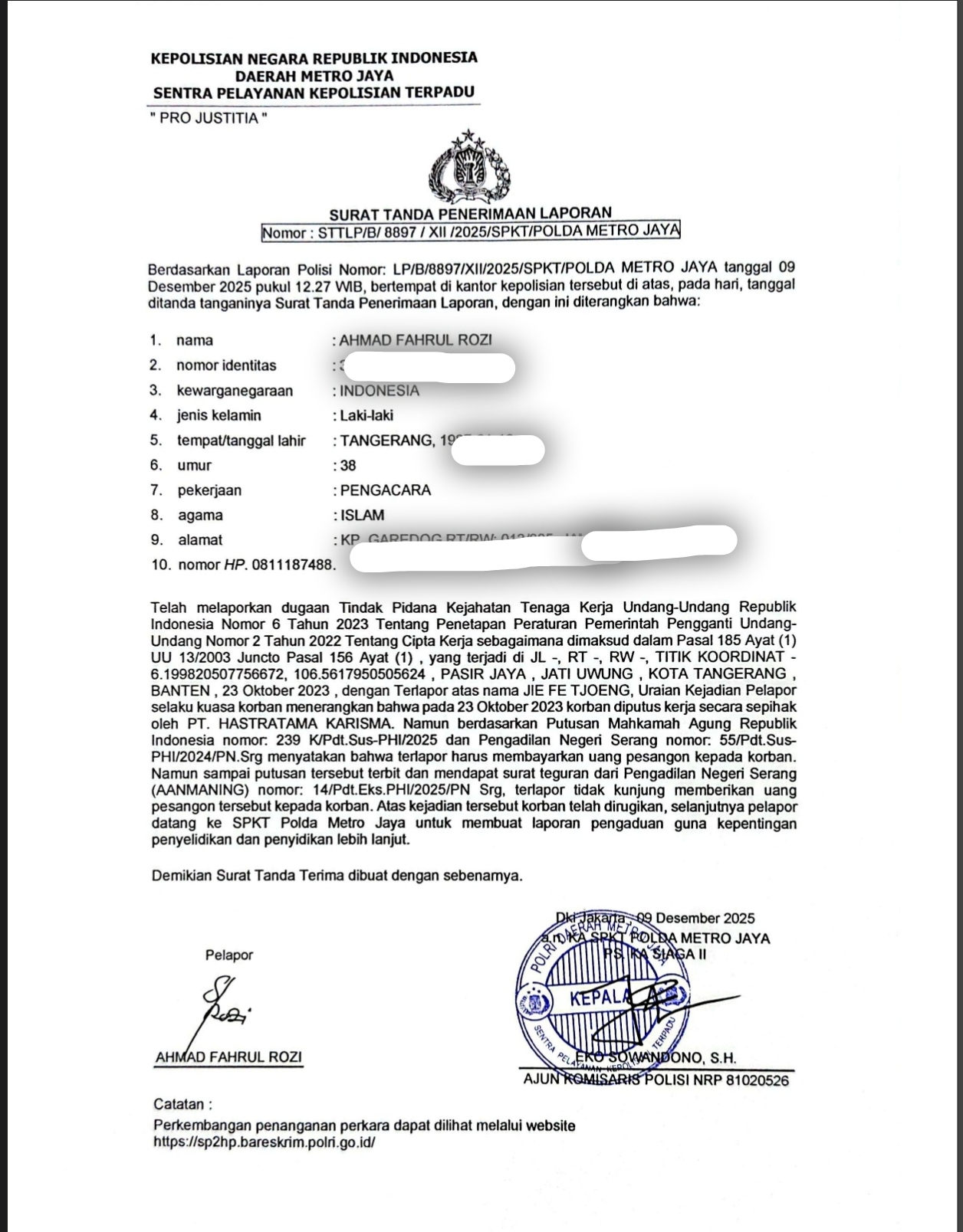 Dalam laporan polisi nomor : LP/B/8897/XII/2025/SPKT/POLDA METRO JAYA, di jelaskan bahwa Jie Fe Tjoeng telah melakukan tindak pidana kejahatan ketenagakerjaan dalam Undang-undang No.6 Tahun 2023 tentang penetapan PERPPU No.2 tahun 2022 tentang cipta kerja, sebagaimana dimaksud dalam pasal 185 ayat (1) yang terjadi di kawasan Jatake Industri, Kelurahan Pasir Jaya, Kecamatan Jatiuwung, Kota Tangerang dengan Sanksi Pidana Maksimal 4 (empat) Tahun Penjara atau Denda maksimal Rp. 400.000.000 (Empat ratus juta rupiah).