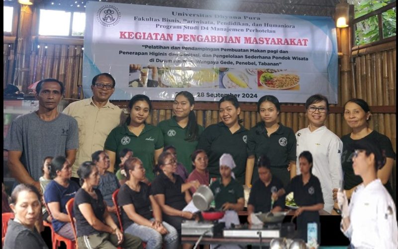 Dr. Sidhi Bayu Turker, S.H., M.Par. menyampaikan materi pemahaman dasar penerapan CHSE, aspek entrepreneur pada pengelolaan pondok wisata daerah tujua wisata dusun Amplas. Dra. Ni Made Erpia Ordani Astuti, M.Pd., membimbing dan mendampingi unjuk kerja berupa pelatihan (demonstrasi dan praktek pembuatan penyiapan dan penataan makan pagi.