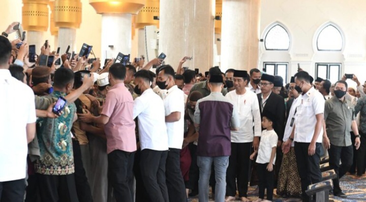 Jakarta,Poskota.Online-Presiden Joko Widodo bersama cucu pertama, Jan Ethes Srinarendra, melakukan salat Jumat berjemaah di Masjid Sheikh Zayed, Kota Surakarta, pada Jumat, 7 April 2023. Dengan mengenakan baju koko berwarna putih, celana hitam, dan peci hitam, Presiden Jokowi dan cucunya tiba di tempat ibadah sekitar pukul 11.25 WIB.