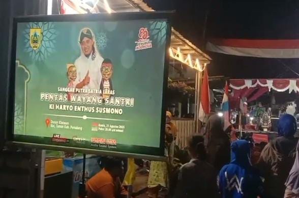 Pemalang, poskota.online – Suasana meriah menyelimuti Dusun Klarasan, Desa Taman, Kecamatan Taman, Kabupaten Pemalang, Kamis (21/8/2025) malam. Ratusan warga tumpah ruah di Jalan Pergiwo untuk menyaksikan Pagelaran Wayang Santri dalam rangka memperingati HUT RI ke-80.