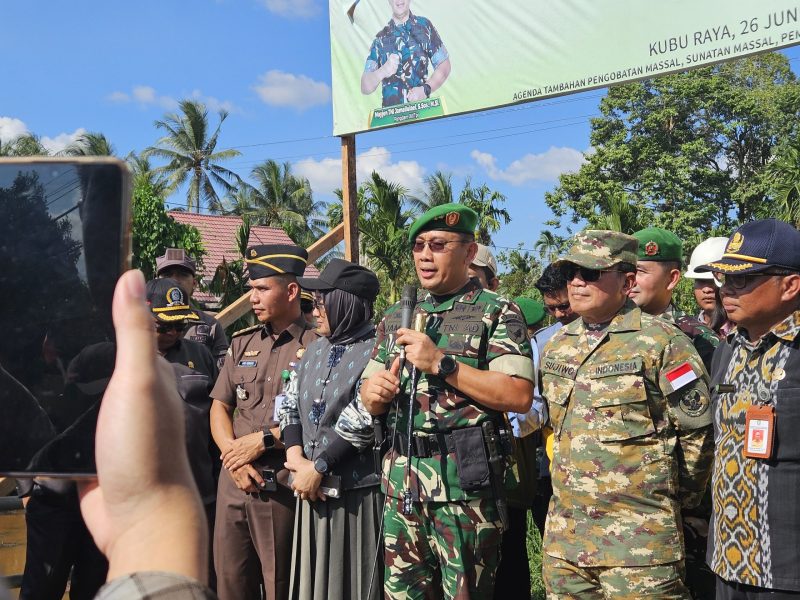 KUBU RAYA Poskota Online- Pangdam XII/Tanjungpura Mayjen TNI Jamallulael, S.Sos., M.Si., bersama dengan Bupati Kubu Raya, H. Sujiwo, S.E., M.Sos., melaksanakan Launching Rekonstruksi Jalan Rasau Jaya Patok 50 dengan Pola Karya Bakti TNI dan Rakyat. Bertempat di Halaman Kantor Camat Rasau Jaya, Kubu Raya, Kamis (26/6/2025).