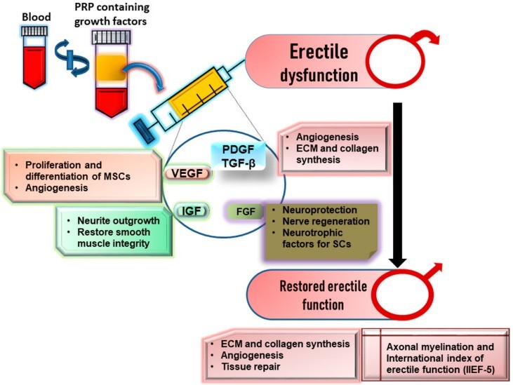 Plasma kaya trombosit (PRP) sebagai sumber biomaterial turunan trombosit untuk terapi DE. PRP turunan darah sangat kaya akan faktor pertumbuhan seperti VEGF, IGF-1, FGF, PDGF, dan TGF-β serta berperan penting dalam proliferasi dan diferensiasi MSC, angiogenesis, pengaturan aliran darah, perlindungan saraf, regenerasi saraf, mielinisasi akson, ECM, dan sintesis kolagen, yang menghasilkan peningkatan indeks fungsi ereksi (IIEF-5). IGF: faktor pertumbuhan mirip insulin, VEGF: faktor pertumbuhan endotel vaskular, FGF: faktor pertumbuhan fibroblas, PDGF: faktor pertumbuhan turunan trombosit, TGF-β: faktor pertumbuhan transformasi beta.