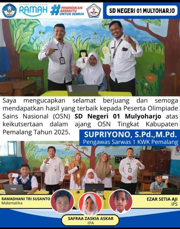 Pemalang, poskota.online – Hati yang penuh perasaan senang dan bangga itu bisa dirasakan oleh guru , Kepala Sekolah ( KS ) dan juga orang tua dari siswa- siswi dari Sekolah Dasar Negeri ( SDN ) 01 Mulyoharjo Pemalang Jawa Tengah sebab dari 2 putra dan 1 putri yang merupakan siswa- siswi didik SDN.01 Mulyoharjo akan mengikuti ajang Olimpiade Sains Nasional ( OSN ) Tingkat Kabupaten di tahun 2025 ini.