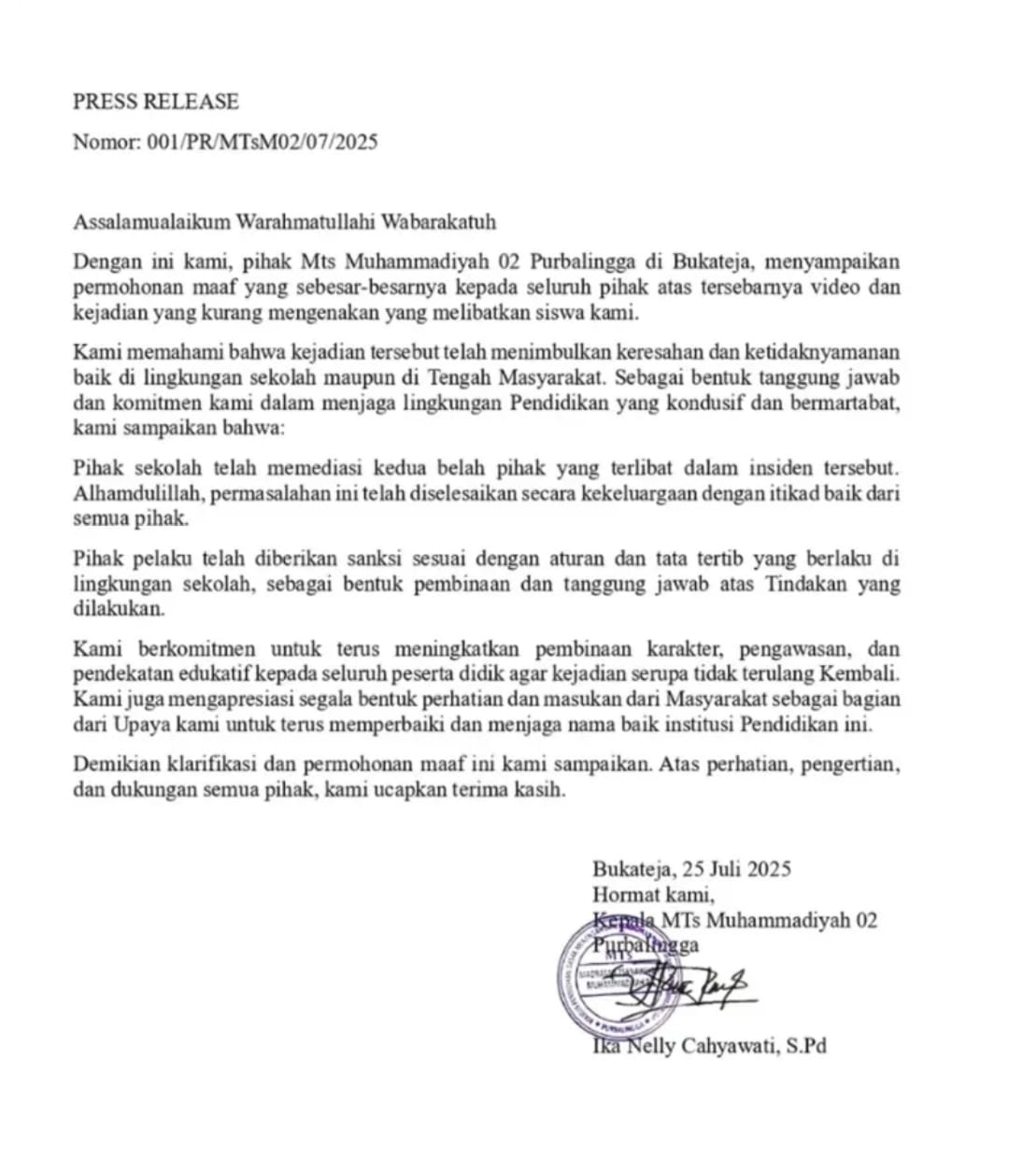 Poskota.online, Purbalingga – Pasca viralnya video kekerasan yang melibatkan siswa MTs Muhammadiyah 02 Purbalingga di Bukateja, pihak sekolah secara resmi menyampaikan klarifikasi dan permintaan maaf terbuka melalui press release yang ditandatangani oleh Kepala Sekolah, Ika Nelly Cahyawati, S.Pd, tertanggal 25 Juli 2025.