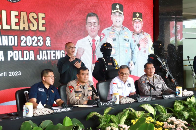 Hal tersebut diungkapkan Kapolda Jateng Irjen Pol Ahmad Luthfi didampingi Dirresnarkoba KBP Lutfi Martadian dan Kabidhumas KBP Iqbal Alqudusy dalam konferensi pers Hasil Anev Ops Bersinar Candi 2023 di Loby Mapolda Jateng pada Selasa, 4 April 2023. Turut hadir pula Kepala BNNP Heru Pranoto yang mendampingi Kapolda dalam memberikan keterangan pers.