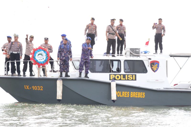 Kapolres Brebes AKBP Guntur Muhammad Tariq, diwakili oleh Kabag Sumda AKP Muawan Subagio, S.H., bersama Kasat Polairud dan anggota lain, mengikuti rangkaian kegiatan di atas kapal patroli milik Sat Polair Polres Brebes dengan khidmat.