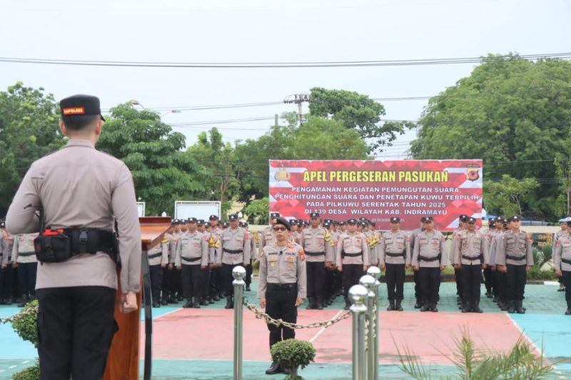 Indramayu,poskota.online – Menjelang pemungutan suara Pemilihan Kepala Desa (Pilkades) Serentak 2025, Polres Indramayu Polda Jabar menggelar apel pergeseran pasukan pengamanan kegiatan pemungutan suara dan penetapan kades terpilih di 139 desa yang melaksanakan pemilihan Kades.