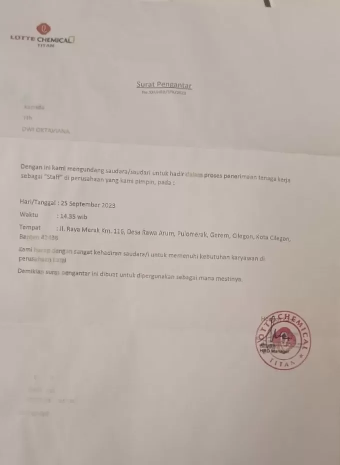 Pasalnya, saat awak media bersama korban mendatangi perusahaan PT. Lotte chemical Titan, perusahaan melalui pihak keamanan mengatakan bahwa itu bukanlah surat yang di keluarkan oleh perusahaan. Dan perusahaan tidak bertanggung jawab atas apa yang sudah di lakukan oleh oknum Tersebut. Pihak perusahaan pun menyarankan untuk menempuh jalur hukum kepada para korban tersebut.