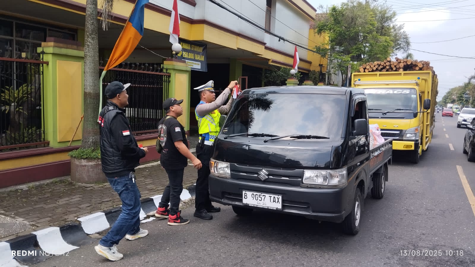Masyarakat yang melintas tampak antusias menerima bendera dan banyak yang langsung memasangnya di kendaraan masing-masing. Suasana penuh semangat dan keakraban turut mewarnai kegiatan tersebut, menandai sinergi yang kuat antara media, aparat, dan masyarakat.