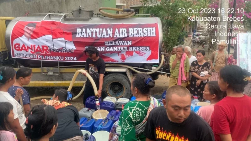 Relawan Teman Ganjar Brebes langsung bergerak menyalurkan bantuan dengan mengirimkan dua unit mobil tangki air bersih kepada warga yang tinggal di dua Pedukuhan yang berada di Desa Pamulihan. Senin (23/10/2023).