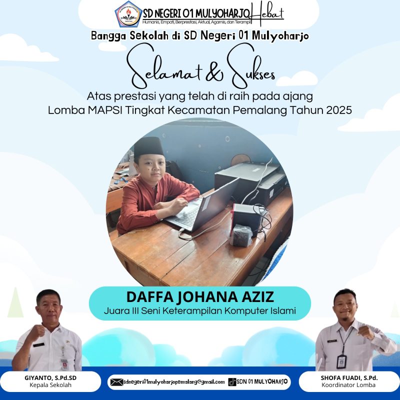 “Alhamdulillah, kami merasa sangat senang dan bangga. Salah satunya adalah Daffa Johanna Aziz yang berhasil meraih Juara 3 Lomba Komputer Seni Islami dalam ajang MAPSI tingkat Kecamatan Pemalang tahun 2025,” ujar Shofa.