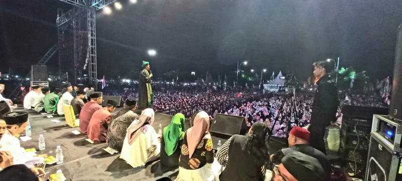 Banjarnegara – Ribuan jamaah warga menghadiri konser sholawat kebangsaan KH Mohammad Ali Shodiqin atau Gus Ali Gondrong. Sholawat untuk mendoakan Ganjar Pranowo dalam kontestasi Pemilu 2024 yang digelar di alun-alun Banjarnegara Rabu (8/11/2023) malam dan berlangsung meriah.