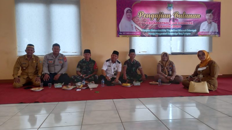 Kapolsubsektor Sukamulya Bripka Alamsyah Bey dalam kegiatan Pengajian Bulanan rutin tingkat Muspika Sukamulya yang beretemakan “Menjalin silaturahmi kita tingkatkan ukuwah islamiyah menuju masyarakat sukamulya yang relijius” ikut serta undangan para alim ulama, sesepuh, tokoh hadir KH. Sahari, Dra. Yati Nurul Hayat, M.Si Camat Sukamulya,