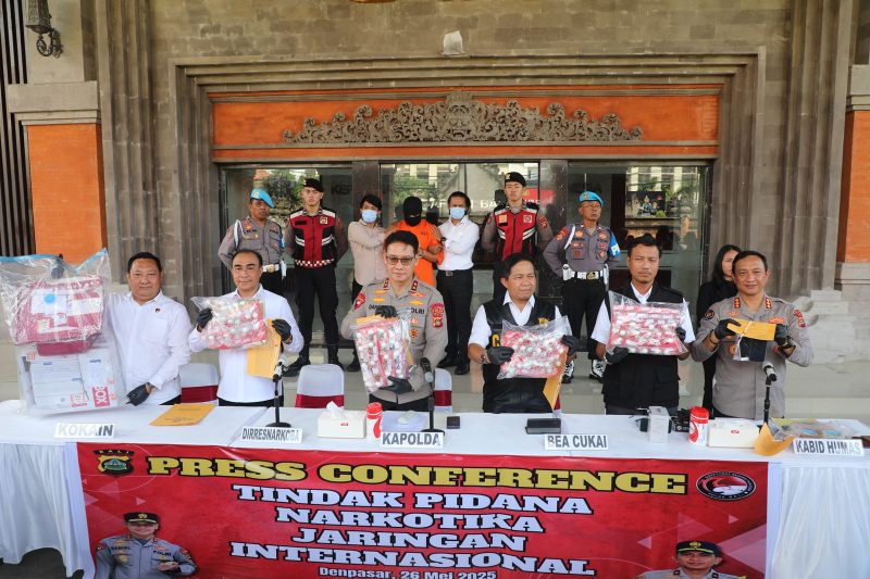 Bali, poskota.online – Saat Konferensi Pers di depan para awak media bertempat di Loby Mapolda Bali, Kapolda Bali Irjen Pol Daniel Adityajaya S.H., S.I.K., M.Si., didampingi Kabid Humas Kombes Pol Ariasandy S.I.K dan Diresnarkoba Kombes Pol Radiant S.I.K., M.Hum., serta perwakilan dari Bea Cukai Bali, kamis 26 mei 2025.