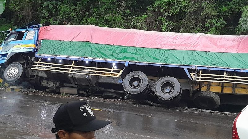 Banyuwangi Poskota Online – Selasa, 9 September 2025, Pukul 06.35 WIB, Sebuah Truk tronton losbak bernomor polisi B 9035 BYV mengalami kecelakaan tunggal di depan Warung Gandrung. Truk yang melaju dari arah Jember menuju Banyuwangi diduga mengalami rem blong.