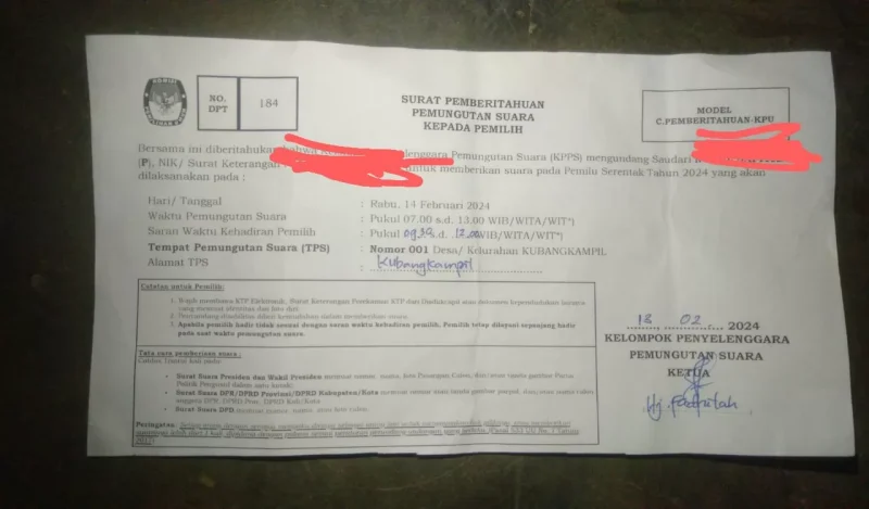 Padahal, Surat Pemberitahuan Pemungutan Suara Kepada Pemilih dari Kelompok Penyelenggara Pemungutan Suara (KPPS) untuk saran waktu yang ditentukan dari pukul 09.30 sampai dengan 12.00 wib. Namun realitanya oknum petugas di TPS Kubangkampil seolah tak mau tau dengan berdalih keterlambatan menolak pemilih untuk suaranya pada pemilu 2024.