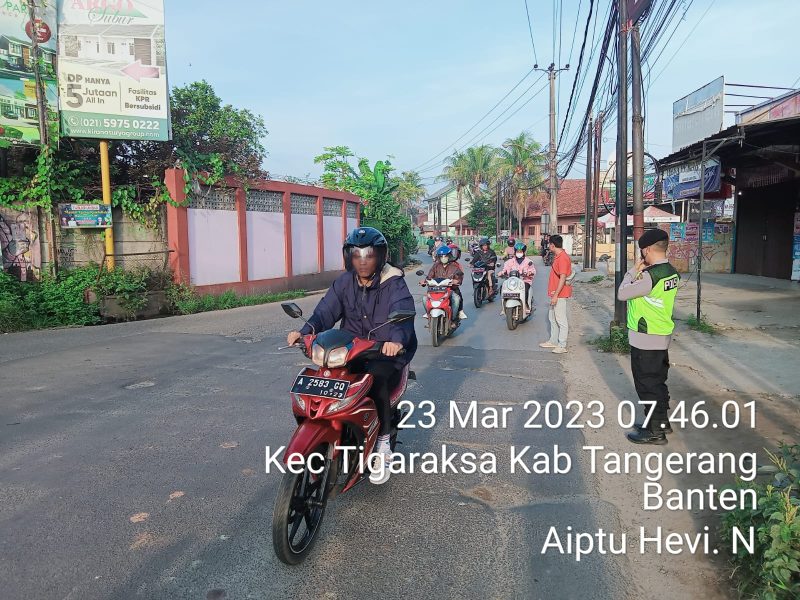 Kab.Tangerang,Poskota.online – Berikan Pelayanan Prima kepada masyarakat di pagi hari Unit Sabhara Polsek Tigaraksa Aiptu Hevi Nusantara melaksanakan pengamanan dan pengaturan lalulintas di simpang tiga Katomas kelurahan Tigaraksa Kecamatan Tigaraksa Kabupaten Tangerang Kamis pagi (23/3/2023).