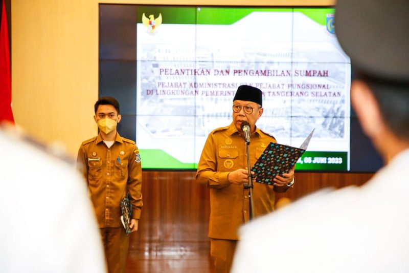 Ratusan pejabat administrasi dan fungsional di lingkungan Pemerintah Kota Tangerang Selatan dilantik oleh Wali Kota Tangerang Selatan Benyamin Davnie, di Aula Blandongan Puspemkot Tangsel, pada Senin 05 Juni 2023.