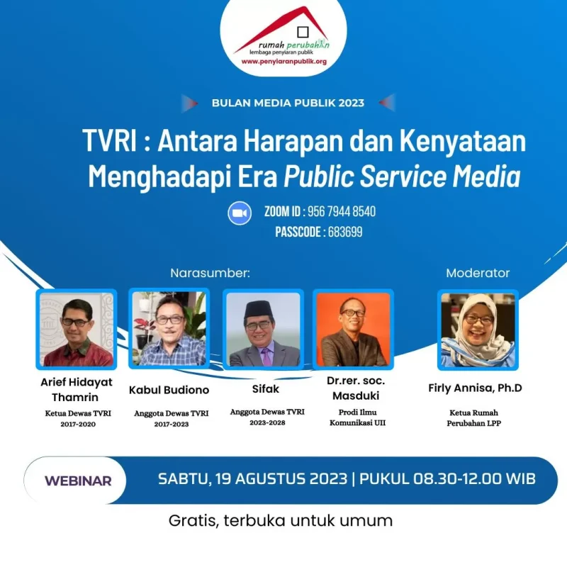 Tangsel,Poskota.Online-Peran televisi publik ternyata sangat penting. Baik untuk berita, edukasi, kesehatan, budaya, olah raga, kebencanaan, religi dan banyak hal kepentingan publik lainnya. Buktinya saat pandemi Covid19, TVRI sangat bermanfaat untuk program belajar dari rumah kerjasama Kemendikbud, program religi ibadah agama dan edukasi kesehatan. Demikian pernyataan Arief Hidayat Thamrin, konsultan dan mantan Ketua Dewan Pengawas TVRI periode 2017-2020 di acara Webinar bersama Rumah Perubahan Lembaga Penyiaran Publik, di hari Sabtu, 19 Agustus 2023. Acara dipandu oleh Moderator Firly Anita dan di hadiri pembicara lain, M. Kabul Budiono (mantan Dewas TVRI 2017-2023), Sifak (Anggota Dewas TVRI 2023-2028) dan Masduki mewakili Akemisi S3 dari Rumah Perubahan Lembaga Penyiaran Publik.